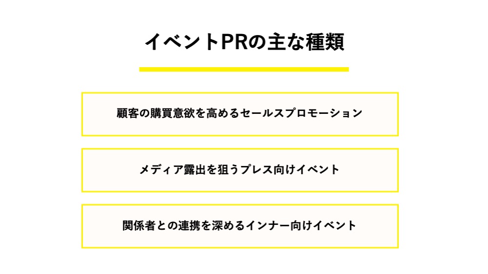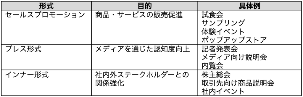 イベントPRには目的や対象者に応じていくつかの種類があります。ここでは代表的な3つの形式を紹介します。自社の目的に合った形式を選ぶことが、成功への第一歩です。