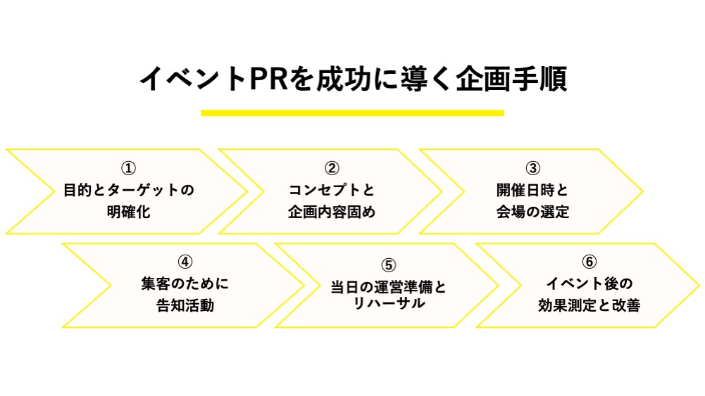効果的なイベントPRを実現するためには、戦略的で計画的なアプローチが求められます。ここでは、企画から実施後の振り返りまで、イベントPRを成功に導くための6つの手順を解説します。