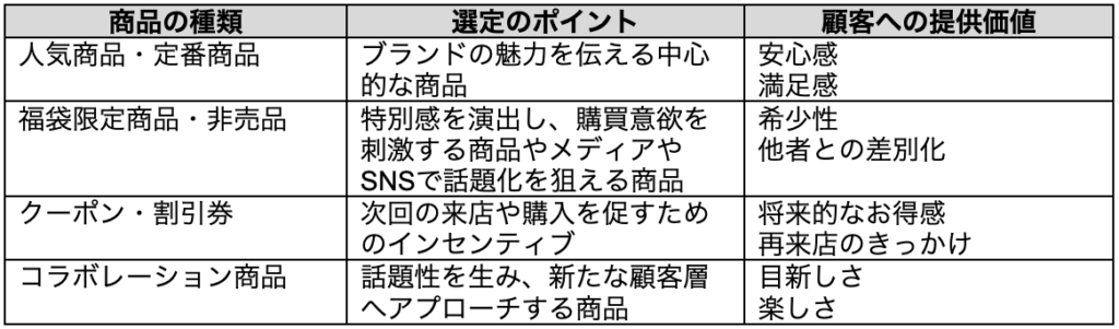 福袋は売れ残り商品ばかりを詰め合わせた「在庫処分セール」のような印象を与えてしまうと、ブランドイメージを大きく損なう危険性があります。福袋を購入した顧客ががっかりするような内容であれば、SNSなどを通じてネガティブな評判が広まり、既存顧客の信頼まで失いかねません。あくまでも、ブランドの魅力を伝えるという視点を忘れずに、顧客が喜ぶ商品をバランス良く選定しましょう。