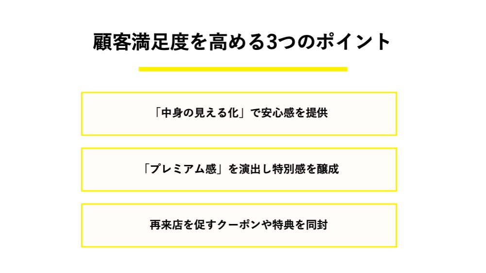 福袋施策の成否は、単に売上だけでなく、購入した顧客がどれだけ満足してくれたかによっても測られます。「買ってよかった」と思ってもらうための工夫が、リピート購入や良好な口コミに繋がります。ここでは、顧客満足度を飛躍的に高めるための3つの重要なポイントを解説します。