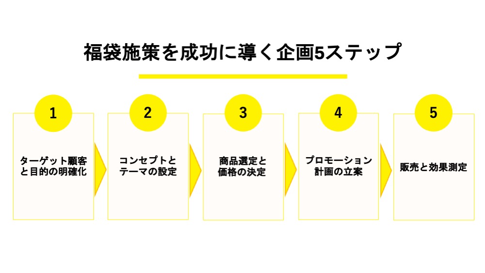 効果的な福袋施策は、緻密な計画と準備の上に成り立ちます。思いつきで商品を詰め合わせるのではなく、戦略的な視点で企画を進めることが成功の鍵です。ここでは、福袋施策を立案し、実行するまでの具体的な5つのステップを解説します。