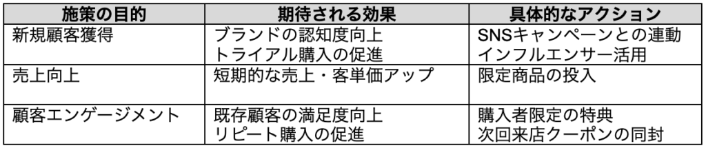 まず、「誰に」「何を」届けたいのかを明確にします。例えば、「20代の女性に、自社のコスメブランドを手軽に試してほしい」「ファミリー層に、家族で楽しめる食品セットを提供したい」など、ターゲット顧客を具体的に設定します。同時に、施策の目的(新規顧客獲得、既存顧客満足度向上、売上目標など)を数値で設定し、その後の意思決定のブレを防ぎます。