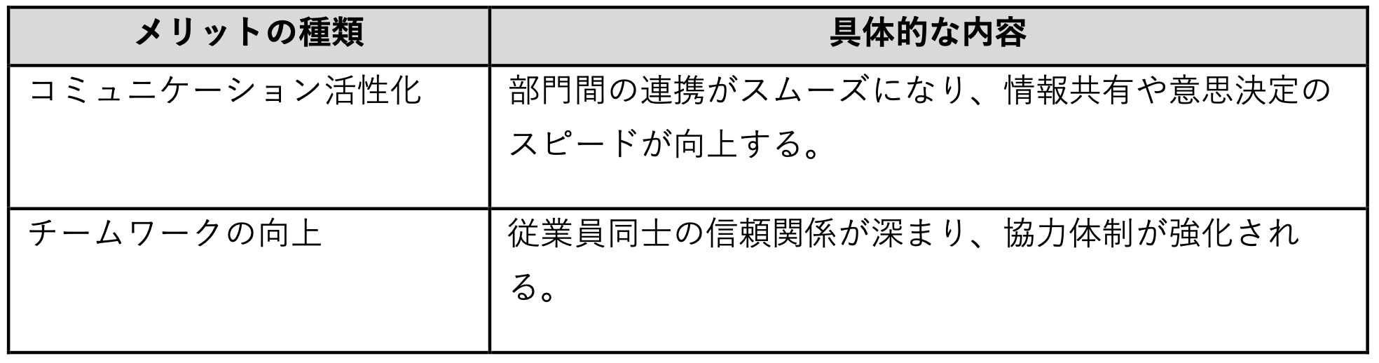部門や役職の壁を越えて、全従業員が共通の価値観や目標を共有することで、組織としての一体感が生まれます。風通しの良い職場環境を育み、円滑なコミュニケーションを促進します。従業員同士が互いに協力し、支え合う文化が醸成されることで、チームワークが向上し、組織全体のパフォーマンスが最大化されます。