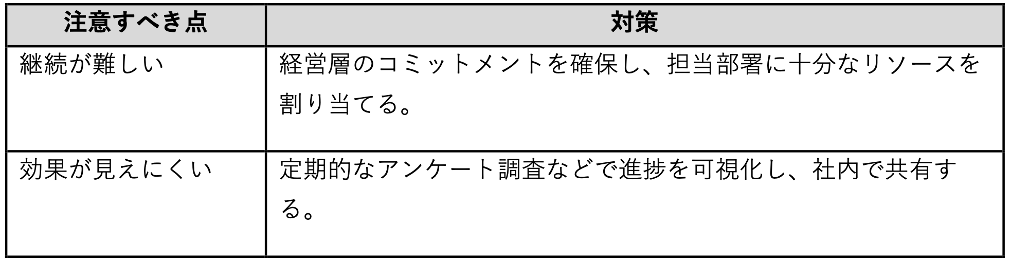 多くのメリットがある一方で、インナーブランディングの推進には注意すべき点も存在します。計画段階でこれらの点を理解しておくことが、成功への鍵となります。