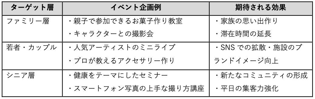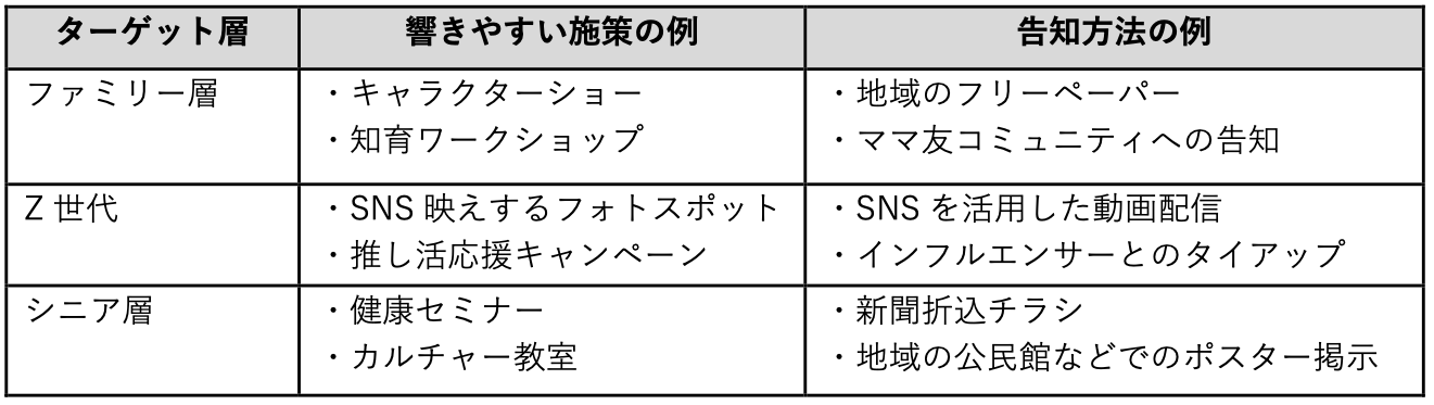 施策を成功させるためには、「誰に喜んでもらいたいか」を具体的に設定することが第一歩です。例えば、「近隣に住む未就学児のいるファミリー層」のようにターゲットを明確にすることで、企画の方向性が定まり、メッセージがぶれることなく、効果的な訴求ができます。
