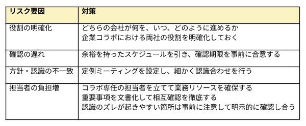また、クリエイティブのトーン&マナーが合わず、既存ファンの期待を裏切ってしまうリスクもあります。監修プロセスを厳格にし、互いのブランド世界観を守るためのルールを決めておく必要があるのです。