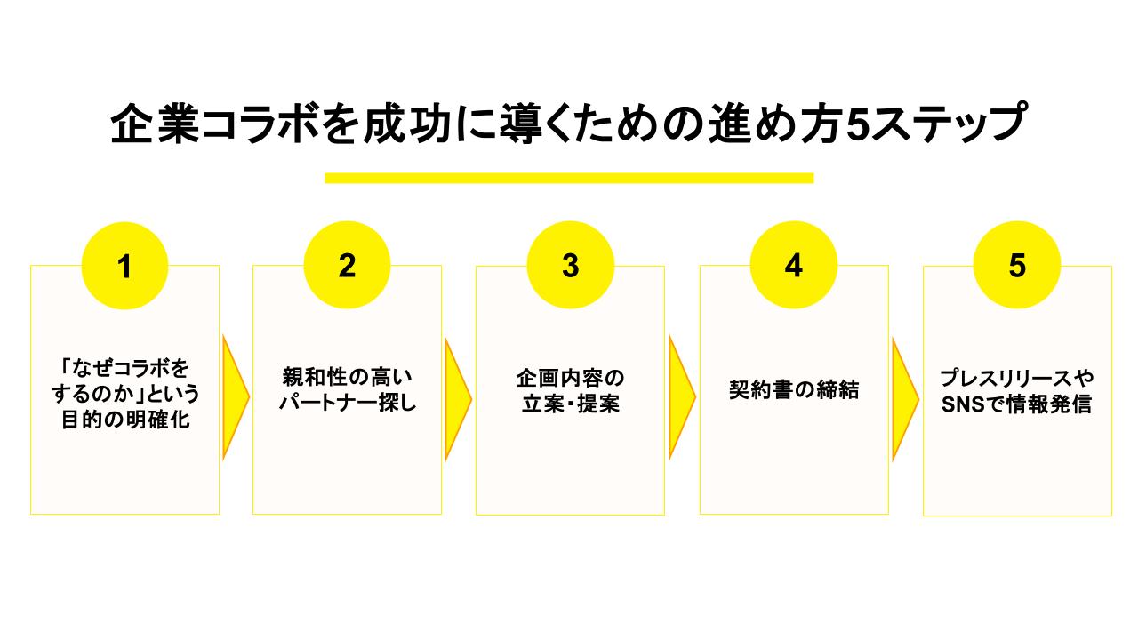 企業コラボは、自社だけでなく相手企業も巻き込むプロジェクトであるため、丁寧なプロセス管理が求められます。思いつきで進めるのではなく、以下の5つのステップに沿って着実に計画を実行しましょう。