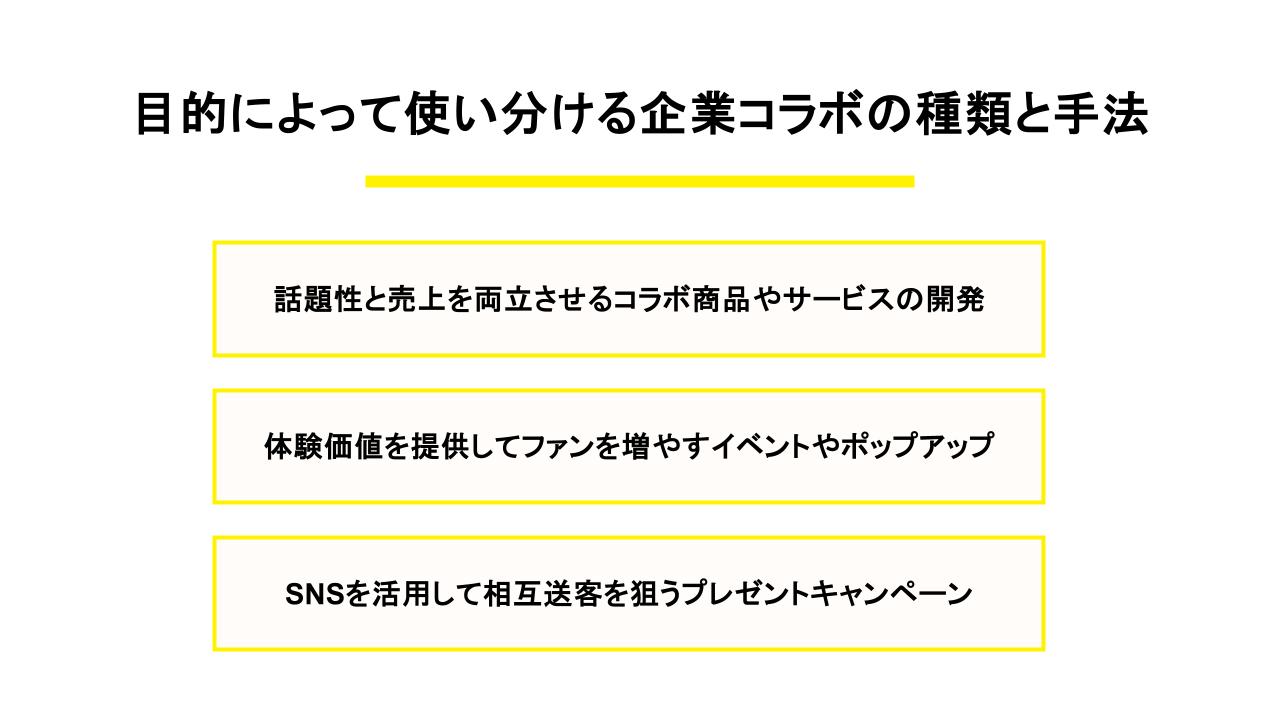 一口に企業コラボと言っても、手法は多岐にわたります。自社の課題や目的に合わせて、最適な手法を選択することが成功への近道です。ここでは代表的な3つの手法を紹介します。