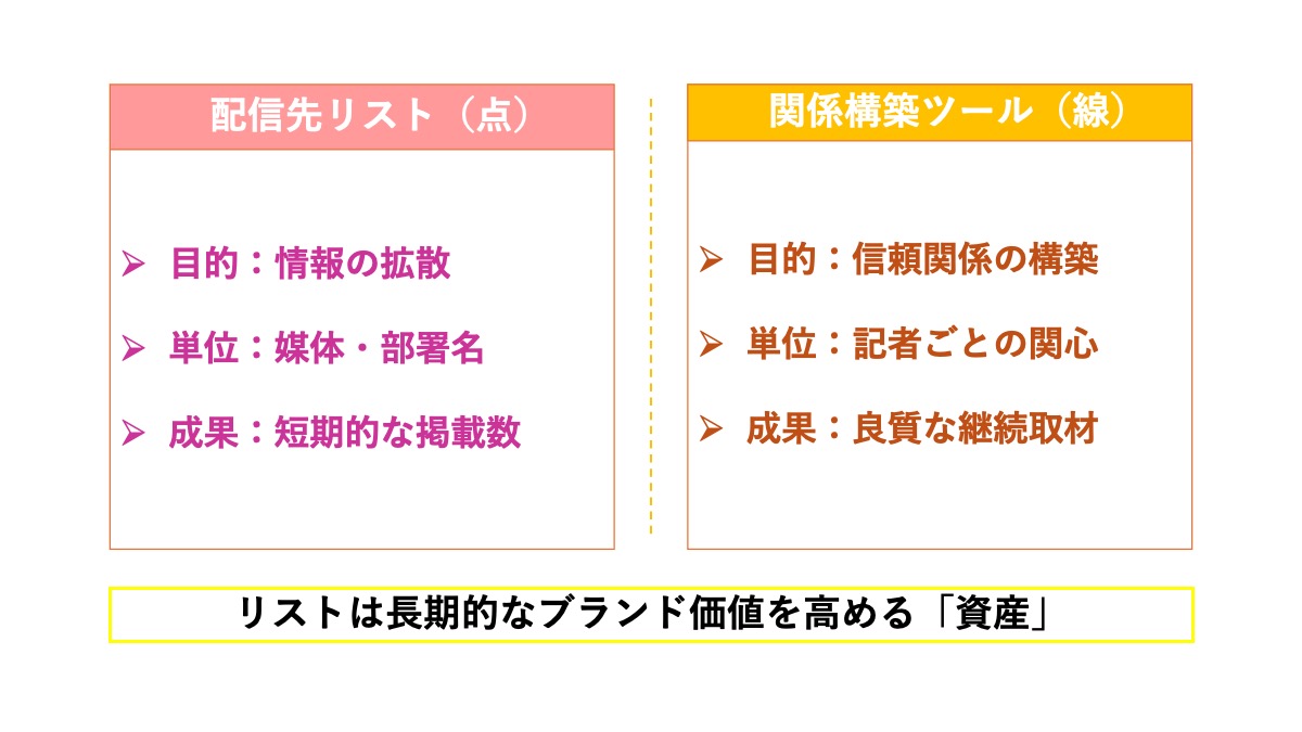 メディアリストを単なるプレスリリースの送付先リストとして扱ってしまうのは、実はとてももったいないことです。PR・広報活動におけるメディアリストの本来の役割は、情報を一方的に拡散することではなく、記者ひとりひとりと良好な信頼関係を築くための「関係構築の設計図」です。リストの捉え方や運用方法を少し変えるだけで、日々のPR・広報活動の質は劇的に向上し、企業姿勢を深く理解した良質な取材獲得へと繋がるはずです。