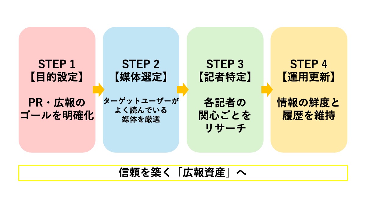 メディアリストの重要性や設計の考え方を把握した次は、いよいよ具体的な作成と運用のステップに入りましょう。ここでは、PR視点で効果を発揮するメディアリストの作成から運用までの具体的なステップを解説します。記者と強固な関係を築くための実践的なツールになるはずです。