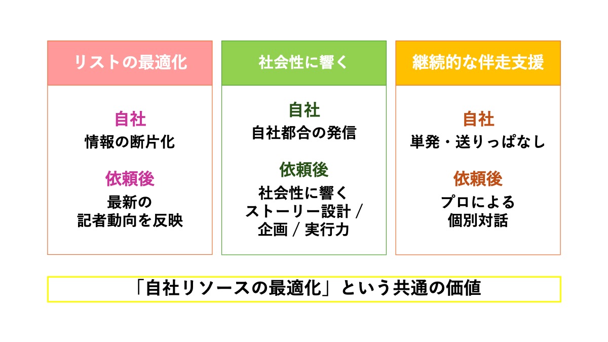 ここまで解説してきたステップに沿ってリストを作成しても、日々の業務に追われてメディアとの関係構築まで手が回らないというPR・広報担当者も少なくないでしょう。また、そもそもPRを通して何ができるのか、どのような基準で記者を選べば良いか、社内の知見だけでは判断に迷うことも多いかもしれません。メディアリストの戦略設計や運用に行き詰まりを感じた際は、PRの専門会社に支援依頼することも有効な選択肢となります。ここでは、PR会社に依頼することで得られる具体的なメリットについて解説します。適切なサポートを取り入れることで、現状の課題を突破する糸口が見つかるはずです。