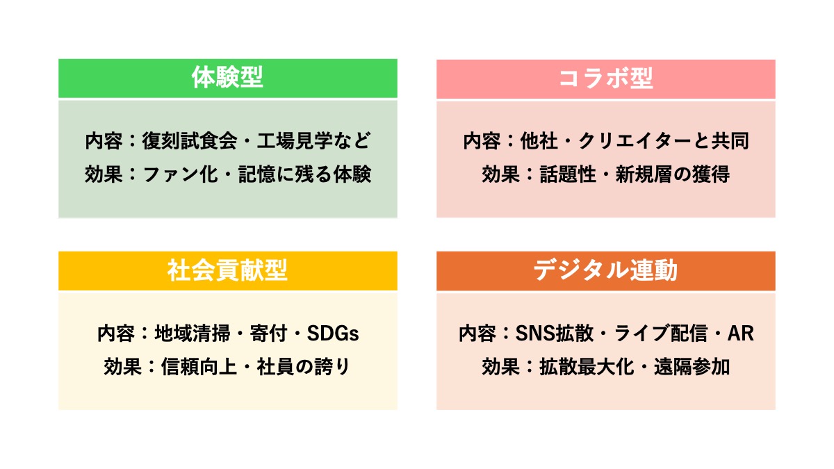 周年イベントの目的やターゲット層が明確になったら、具体的な企画へと落とし込んでいきましょう。ターゲットの関心を惹きつけ、企業のメッセージを効果的に届けるためには、いくつかのアプローチを組み合わせることが効果的です。自社のブランドイメージや予算に合わせて、最適な手法を選択することが成功への近道です。ここでは、実際に多くの企業で取り入れられて成果を上げている周年イベントのアイデアをご紹介します。