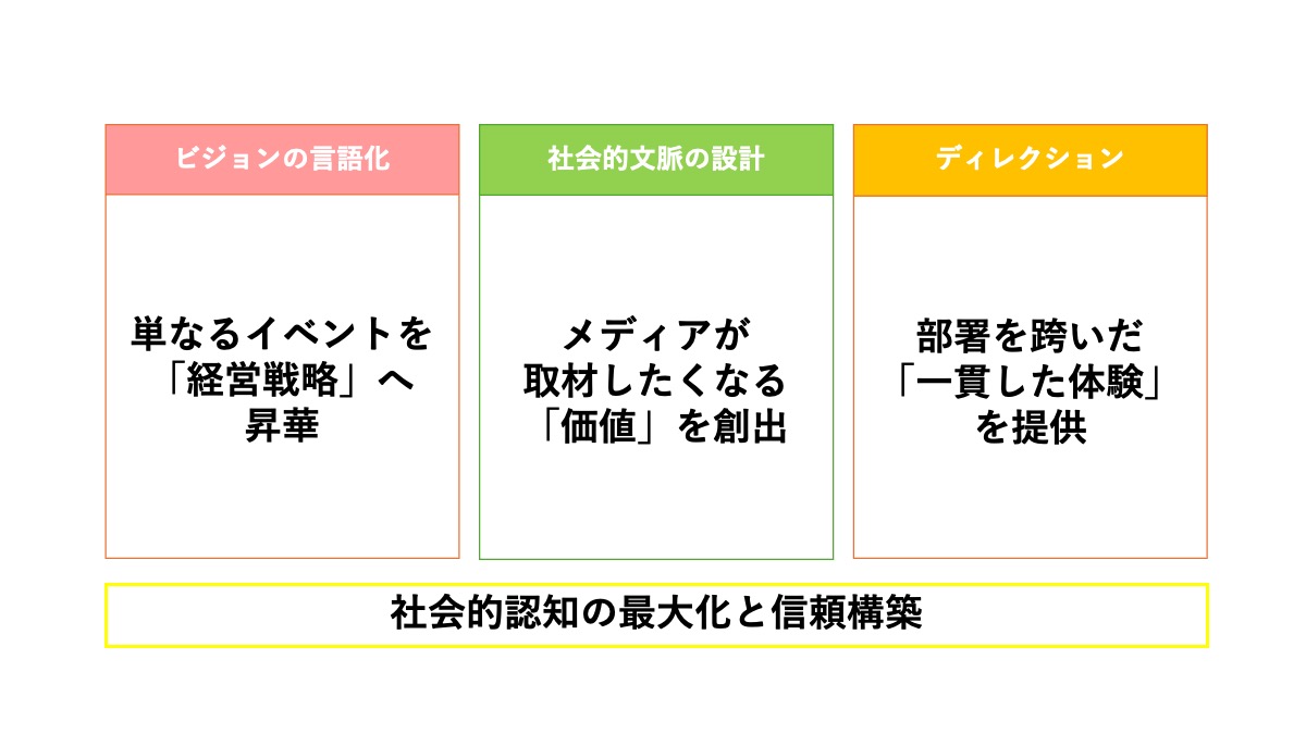 | 3.報道やSNSでの波及 | メディアが取材しやすい資料やSNSで共有しやすい体験コンテンツを用意する | 第三者が記事化したくなるような社会的意義や独自のストーリーを設けること |