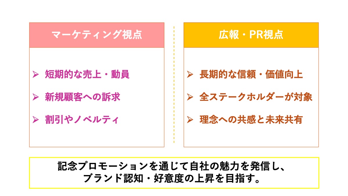 PR・広報の観点では、周年事業は一過性のキャンペーンではなく、顧客や地域社会などのステークホルダーとの絆を深め、長く愛される状態をつくるための重要な施策です。記念のプロモーションを行いやすいタイミングでもあるので、日頃の感謝を伝える特別な体験を提供することで、ブランドに対する愛着をさらに高めることができます。