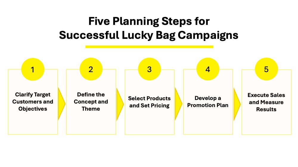 Effective lucky bag initiatives are built on meticulous planning and preparation. The key to success is to proceed with planning from a strategic perspective, rather than simply packing products together on a whim. Here, we will explain the five specific steps from planning to executing a lucky bag initiative.