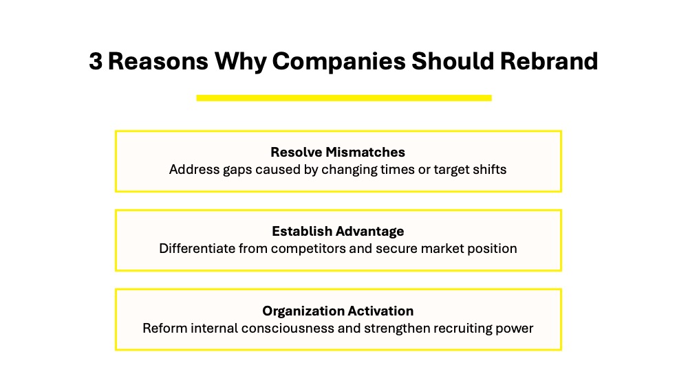 Why is it necessary to undertake rebranding despite the risks? The purpose is not merely cosmetic changes, but solving management challenges. The main purposes and benefits that companies gain from rebranding can be broadly classified into three categories.