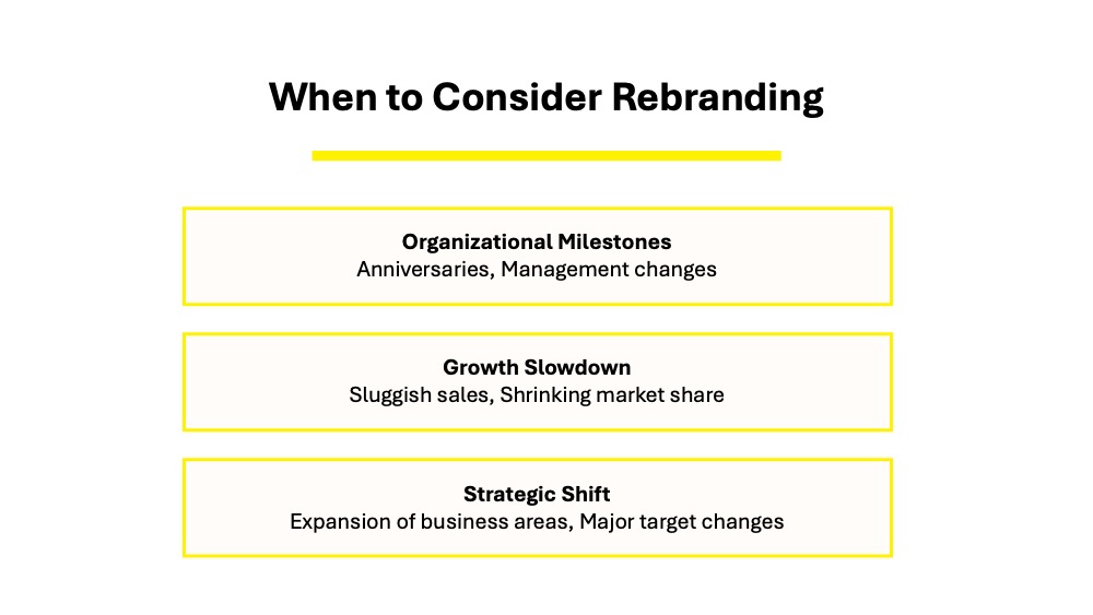 Rebranding is not something that can be done whenever you feel like it. To succeed, it’s necessary to identify the appropriate timing when internal and external momentum is building. Generally, here are three timing indicators that signal when rebranding should be considered.