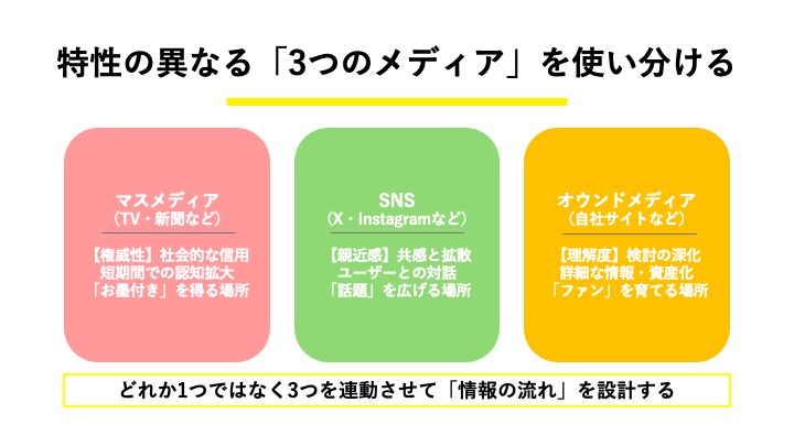 The three types of media—TV, SNS, and owned media—each play different roles, so media strategy is rarely completed with just one. What is important is leveraging the strengths of each medium while coordinating them and designing a natural “flow of information” in advance.