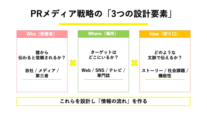 What is important in PR activities is the strategic design of three elements: “who,” “where,” and “how” to communicate. First, “who” refers to the source of information. Whether your company speaks directly, has third-party media speak for you, or communicates through influential experts or influencers. Just changing the messenger can significantly alter the credibility and reception of information.