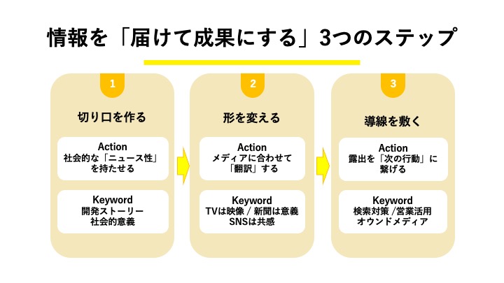 Even if you continue issuing press releases thinking “we just want media coverage,” it often doesn’t lead to the expected business results. To successfully advance media strategy, rather than making exposure itself the goal, you need to consider what impact that exposure should have on your business and design backwards from there.