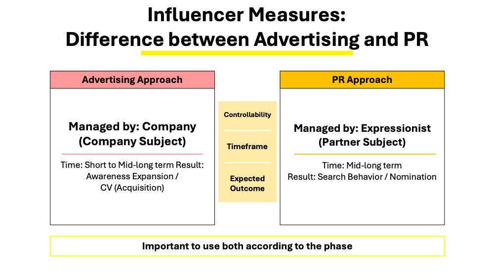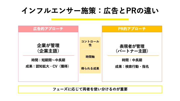 Influencer marketing strategies broadly involve two approaches: the “advertising approach” and the “PR approach,” which differ in methods and objectives.