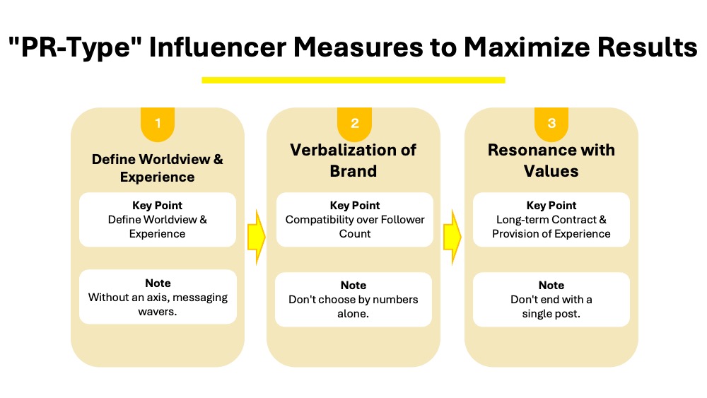 Influencer marketing is not merely a dissemination method but also a PR activity that builds brand trust through third-party voices. Therefore, strategies that focus solely on follower count or buzz tend to result in temporary exposure and rarely lead to subsequent actions such as brand understanding, direct inquiries, or store visits.