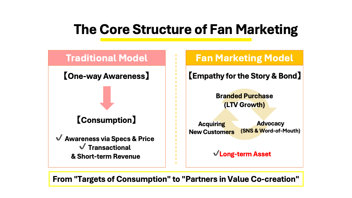 Traditional marketing has prioritized “awareness”—getting the name known—above all else. On the other hand, fan marketing aims to go beyond being known and foster a strong “bond” between the brand and its customers. Instead of appealing only through product functionality or price, we build a deep relationship of trust where customers say, “I like it precisely because it’s this brand,” by having them empathize with the company’s vision and story. A major characteristic of fan marketing is the emphasis on creating a deep and long-lasting bond with each individual.