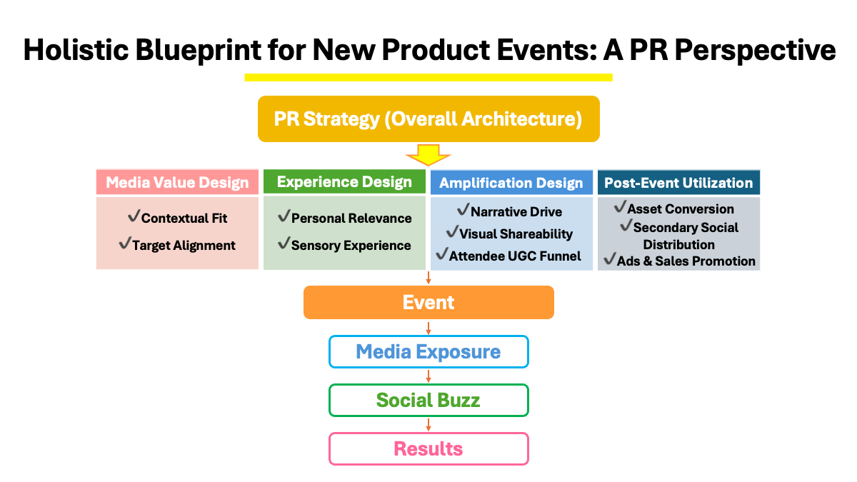 Specifically, articulate the product’s social significance and design experiences that allow participants to truly feel its value. In addition, it is important to define in advance the routes through which information will spread, and to continue communicating after the event by leveraging repurposed content and other assets.
