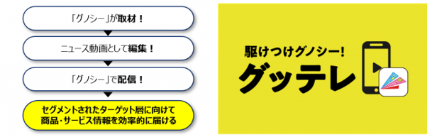 “GUTTELE” is a service that edits and distributes video news content. By converting video content into “natural and valuable information” and approaching highly compatible target groups, we aim to maximize appeal. Video content is efficiently distributed to segmented target groups using the information curation app “Gunosy.” Distribution destinations can be delivered by selecting tabs, narrowing down by age, gender, and place of residence on “Gunosy,” which boasts 35 million downloads, and by distributing on SNS according to attributes, the appeal to the target can be maximized. https://grill.co.jp/gutele/