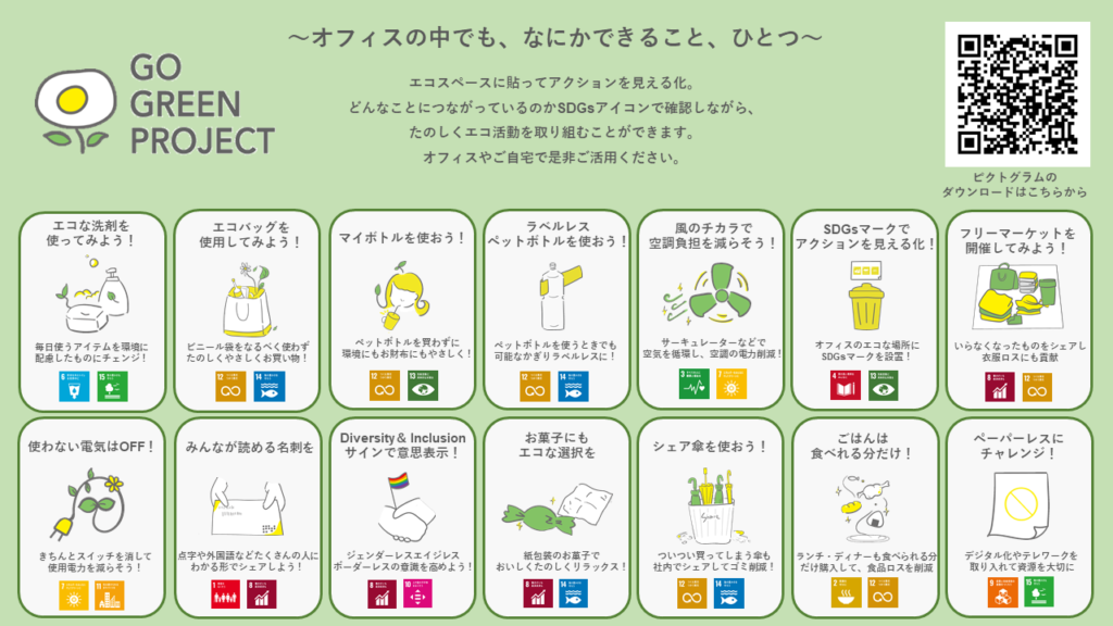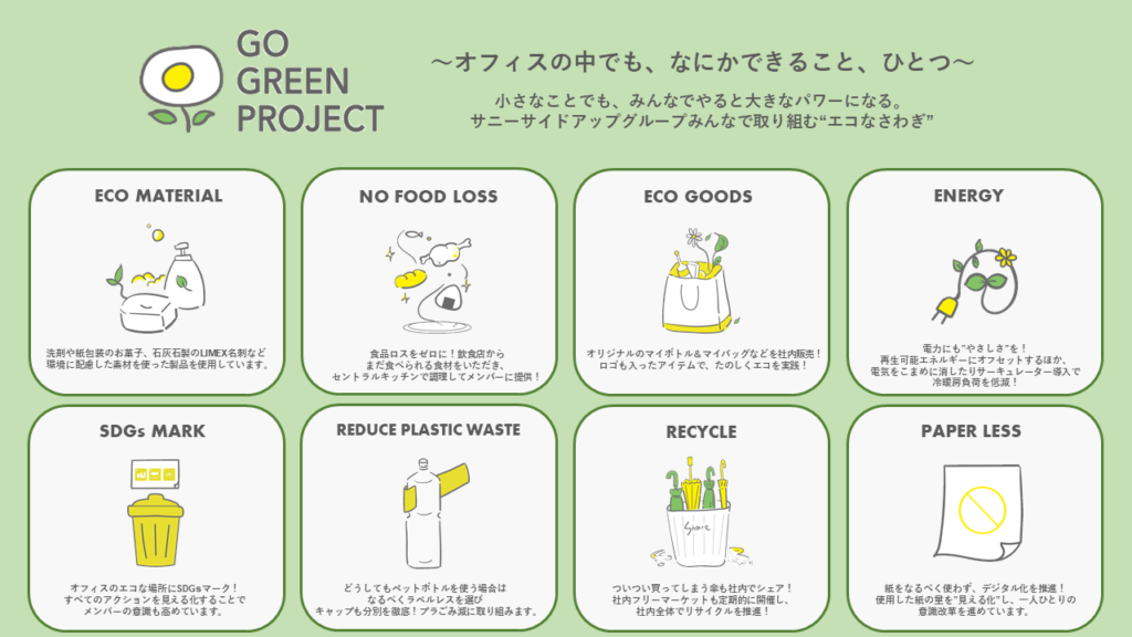 SUNNY SIDE UP GROUP Inc. (Head Office: Shibuya-ku, Tokyo; President and CEO: Etsuko Tsugihara; hereinafter, “the Company”) will launch the “GO GREEN PROJECT,” a project to “gently encourage” sustainability promotion activities by companies and individuals, in line with Global Goals Week (period: Friday, September 17, 2021 to Sunday, September 26), which will be held during the United Nations General Assembly. As the first initiative of the project, the sustainability promotion activities practiced at the Company’s head office are announced as an “8 Action List.” Each action is compiled as a pictogram material and made available free of charge on our website so that other companies can also use it.