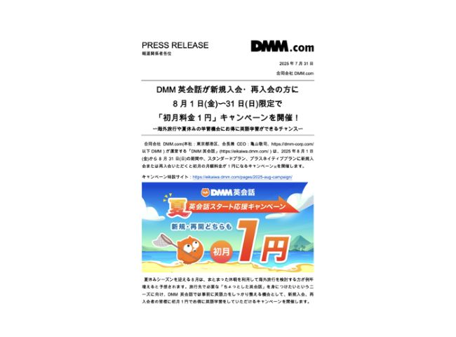DMM英会話が8月1日(金)〜8月31日(日)限定で実施している、特定のプランの入会初月1円キャンペーンを実施。過去に複数回実施しているキャンペーン情報の話題化が求められたため、プレスリリースの1枚目をメディア限定のお得チラシ風にデザインし、リリースを作成。ブランドカラーのオレンジをベースにしたインパクトあるデザインで、他企業のプレスリリースと差別化を図った。また、英会話に親和性が高い層に直接情報訴求するために、DMM英会話にゆかりのある<span>人気英会話YouTubeチャンネル</span>とタイアップを実施し”海外旅行で使える英語“の動画を公開。