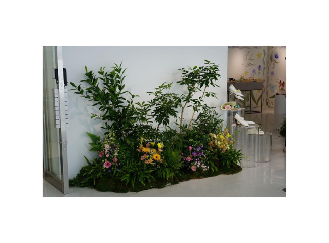 サステナブルなブランドであること、またSSの世界観を伝え、インフルエンサーが写真を撮りたくなる会場にするため、生花や本物の苔をディスプレイに使用。パネルもただのロゴだけでなく、SSのテーマとなっている花のデザインを取り入れることで、自然と写真を撮りたくなる会場に仕上げた。
